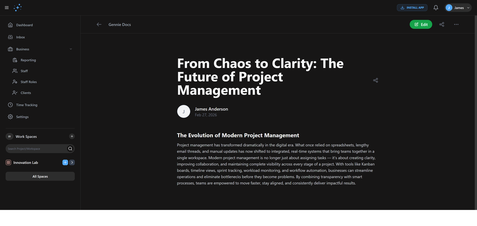 Stop searching for that one lost Google Doc. Gennie Docs puts your knowledge base right next to your code and tasks, creating a true single source of truth.